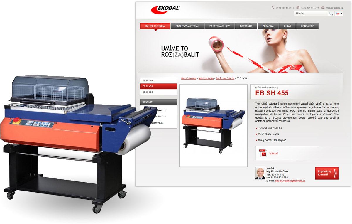 Packaging machines Ekobal are easily configurable and like it even with their detailed introduction on internet. Machine details dominated by a large photo including the ability to add a photo gallery. Short informational text is terminated by contact. More detailed information is then designed using dynamic tabbed menu.